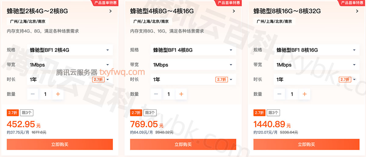 | CVM蜂驰型BF1(BF1.2XLARGE32) | 8核32G | 1M到50M带宽可选 | 20GB起步 | 广州/上海/北京/南京 | 2112.74元1年、391.25元1个月 |
