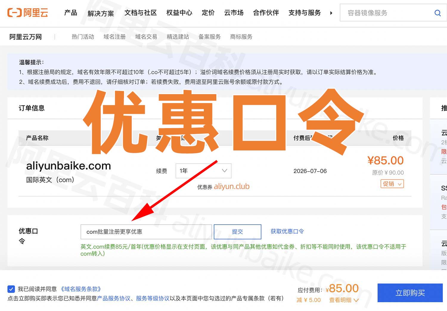 | com域名续费 | com批量注册更享优惠 | 原价90元一年,使用优惠口令后85元一年 |